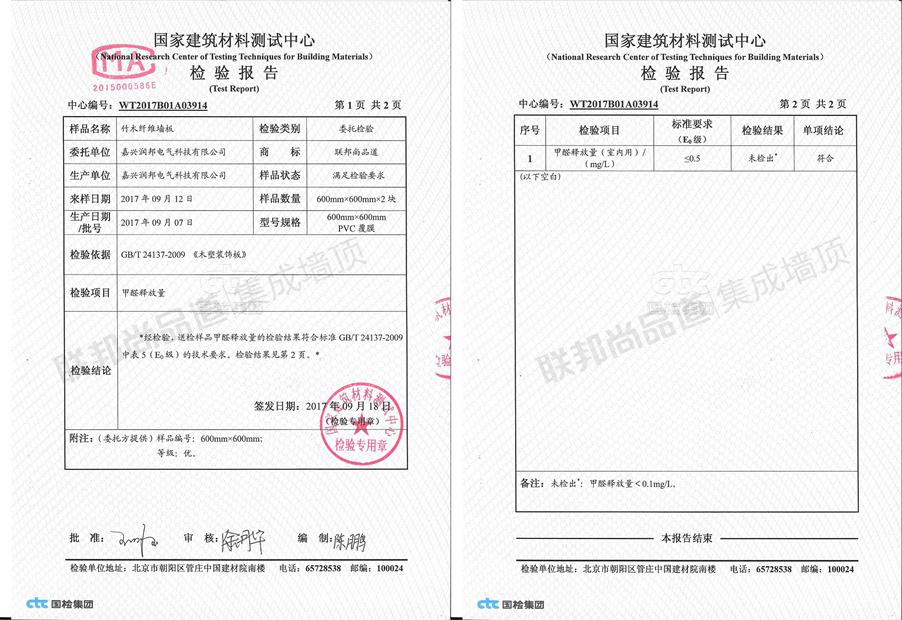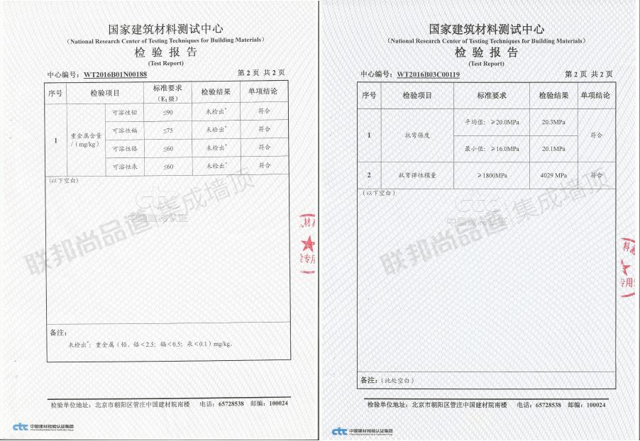 聯邦尚品道NGBS體系物理化學指標:1、甲醛性能,2017年9月權威檢測機構中國建筑材料測試中心最新檢測數據,成品(已覆膜)甲醛檢測結果未檢出(甲醛釋放量<0.1mg/L),遠優于E0級標準≤0.5mg/L。2、表面耐冷熱循環性能,表面無任何裂紋、鼓包、起泡情況,尤其是在長期使用過程中,由于PUR很好的耐高低溫的優點,在一年四季冷熱交替環境下使用無憂。3、物理性能指標,抗彎強度平均值:≥20.0Mpa抗彎彈性模量≥1800,邵氏硬度(HD)≥55,檢測數據高于相應國家標準,工廠有專門定制的檢測儀器檢查每批材料,確保產品符合NGBS標準;4、吸水膨脹率指標,簡單的小實驗,將產品放至水中浸泡,尺寸無明顯變化;5、防火性能指標,達到B1,離開明火不會繼續燃燒,符合家裝和工裝的墻面要求;5、重金屬指標,產品未檢出鉛、鎘、鉻、汞可溶性重金屬,家居安心使用。7、剝離力指標,由于PUR優異的粘貼性能,聯邦尚品道墻面的膜面很難被剝離,連邊角也是如此。