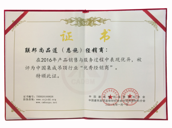 恩施向總與聯邦尚品道的三生三世緣分,得從2012年底說起,以人力資源管理出身的向總因聯邦尚品道在四川直營店實力經營和推廣,開始他在家鄉恩施聯邦集成吊頂的創業之路。在13年聯盟活動興起時,向總以干實事、肯吃苦的個人魅力被推薦成為聯盟會長至今,每年都為恩施業主帶去至少4場至尊聯盟優惠活動,聯邦尚品道集成吊頂也當之無愧成為當地領軍吊頂品牌。2016年,恩施聯邦更是被中國建筑裝飾材料協會授予中國集成吊頂行業“優秀經銷商”的榮譽稱號。